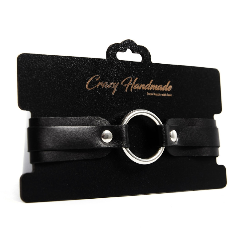 Однослойный чокер из натуральной кожи. По бокам расположены два стальных полукольца, через которые продета прочная металлическая цепочка с хромированным кольцом.