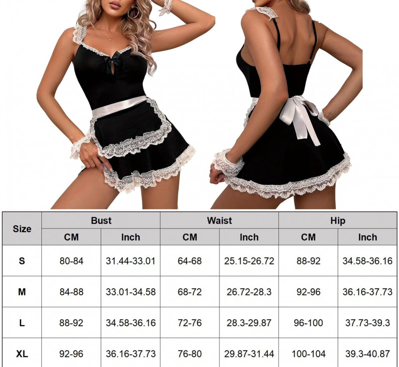 Комплект состоит из платья, фартука, чепчика, нарукавников и трусиков-стрингов.